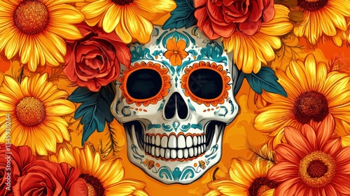 Festive Sugar Skull with Flowers Art