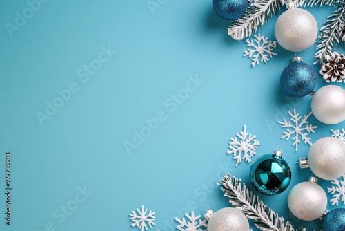 Festive winter decoration featuring blue and silver ornaments, snowflakes, and fir branches on a bright turquoise background.
