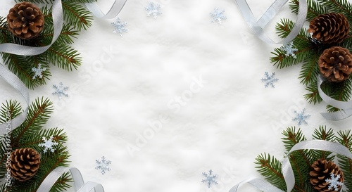 Festive winter scene featuring pine branches, pinecones, silver ribbon and snowflake decorations.