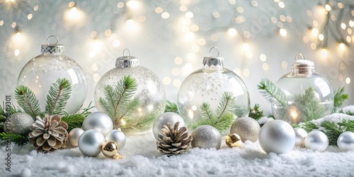Festive Winter Wonderland Sparkling Ornaments, Cones, and Evergreens Resting on a Snowy Surface with a Glimmering Light Background