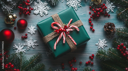 Festively wrapped green gift box adorned with candy canes and red berries during the holiday season