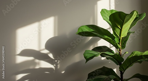 Fiddle leaf fig plant in a pot with sunlight and shadow on the wall