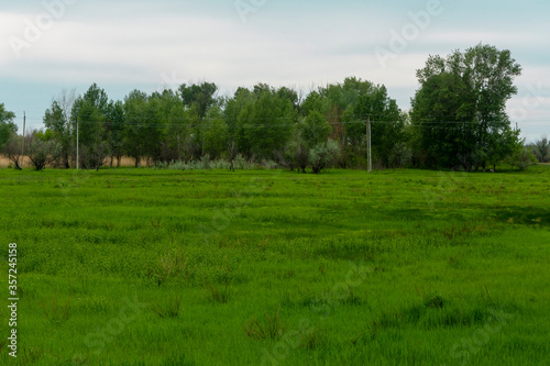 Field with green grass on a summer day. Far away are trees and sky. Beautiful landscape of summer nature.
