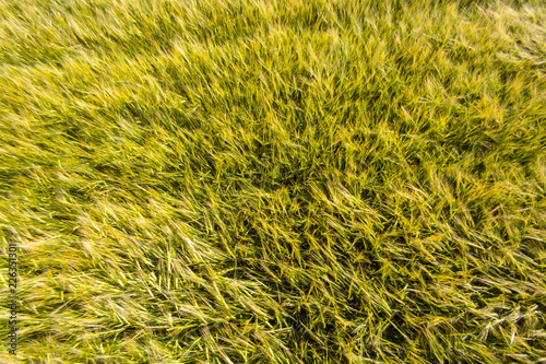 Field with unripe green wheat. Spikes of wheat. Texture effect. Top view. View from above