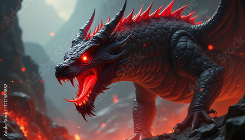 Fierce Black Dragon with Red Spikes in Volcanic Landscape Fantasy Creature Mythological Beast