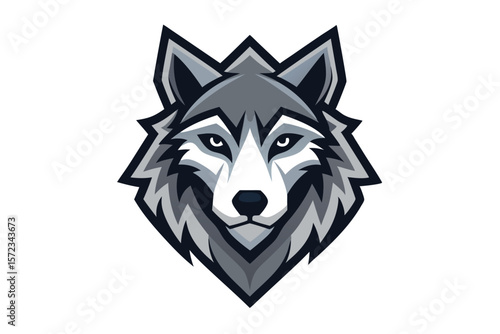 Fierce gray wolf head possesses striking orange eyes within a geometric frame