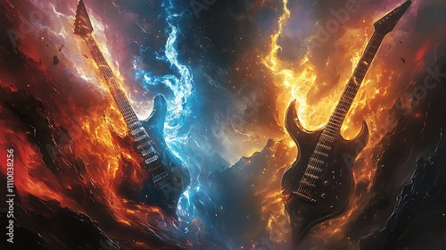 Fiery and icy electric guitars clashing in a dramatic, fantastical scene.