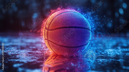 Fiery basketball with water reflection.