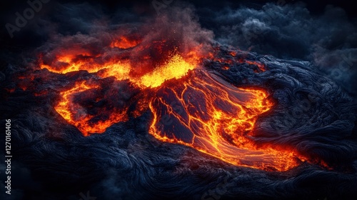 Fiery Cascade, Molten Lava Flowing Down Dark Volcanic Terrain