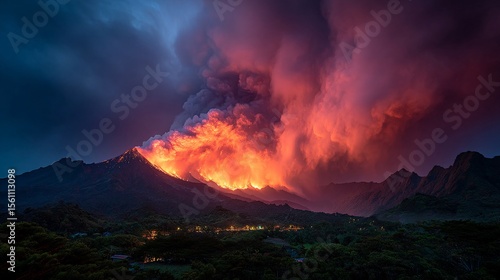 Fiery Eruption of Volcano at Dusk with Dramatic Cloud of Ash