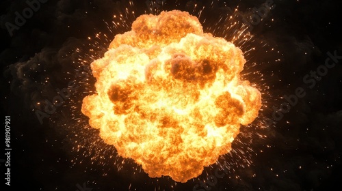 Fiery Explosion with Sparks and Smoke on Black Background