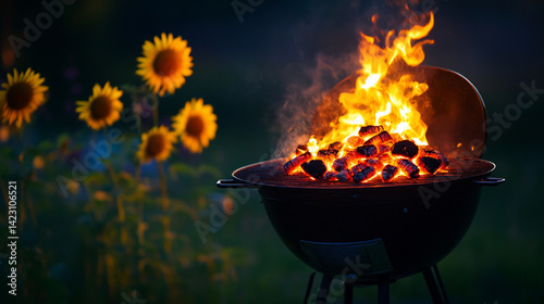 Fiery grill, sunflowers in background