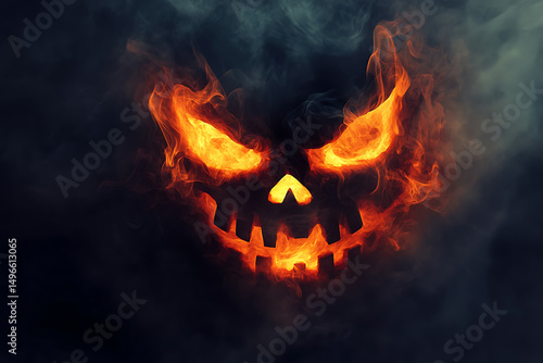 Fiery Halloween Skull with Glowing Eyes Emerging from Dark Smoke Background
