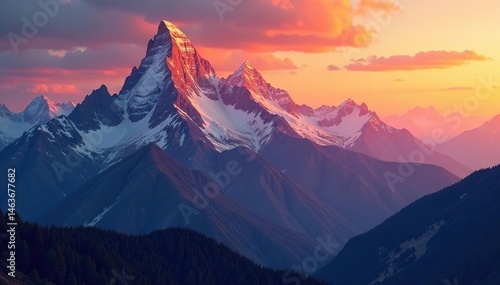 Fiery orange hues paint the peaks, shadows lengthen , amazing, nature, clouds