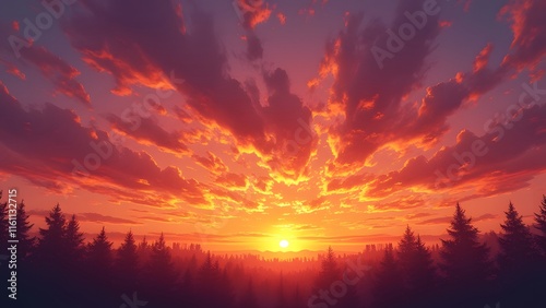 Fiery Sunset Landscape, Vibrant Orange and Purple Sky over Silhouetted Beige Trees