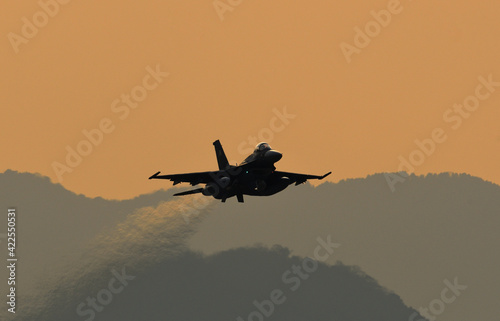 Fighter aircraft in evening sky.