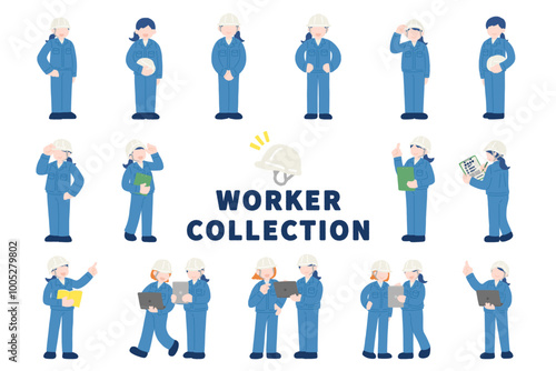 いろいろなポーズをしたヘルメット・作業服の女性[全身]のフラットなイラスト(セット)