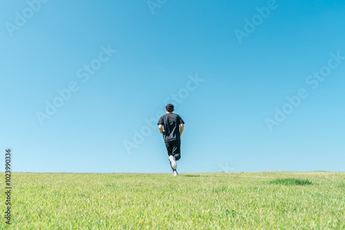 青空の下でランニング・ジョギングをする男性(アスリート・有酸素運動・ワークアウト・フィットネス)