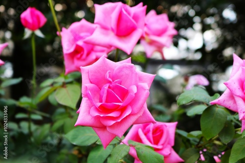 華やかに咲くピンクのバラの花 秋のバラ園