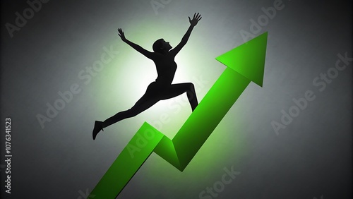 成長と興奮を象徴する、上に緑色の矢印を付けてジャンプする人のシルエット