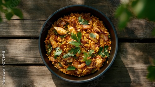 新鮮なハーブを添えた素朴なスペイン風パエリア、上から見た図