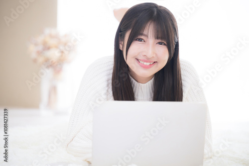 うつ伏せでパソコンをするニットを着た若いかわいい笑顔の女子のクローズアップのカメラ目線