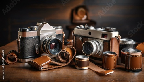 낡고 빛바랜 가죽 케이스에 보관된 고전적인 필름 카메라와 흩어진 필름 롤들