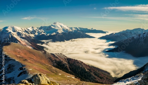 산꼭대기 풍경 눈으로 덮인 산봉우리와 그 아래로 펼쳐진 운해