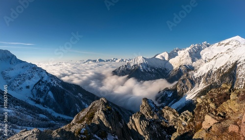 산꼭대기 풍경 눈으로 덮인 산봉우리와 그 아래로 펼쳐진 운해