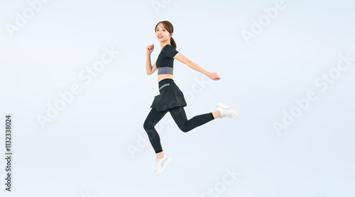 スポーツウェアを着てジャンプする女性の全身写真