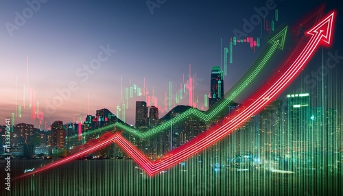 빨간색과 녹색의 상승 곡선이 강조된 주식 시장의 추상적 표현, 배경에는 번쩍이는 도시의 실루엣과 함께 부드럽게 상승하는 선 그래프