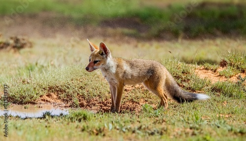 바람에 먼지가 날리는 초원 위에서 물웅덩이를 찾는 작은 여우의 모습