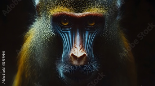 暗い背景で見つめるマンドリルのクローズアップ