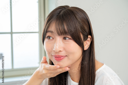 鏡を見て肌を確認する女性