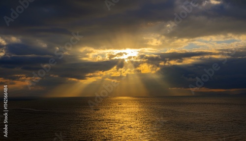 구름이 걷히며 어두운 하늘 사이로 환하게 비치는 황금빛 태양