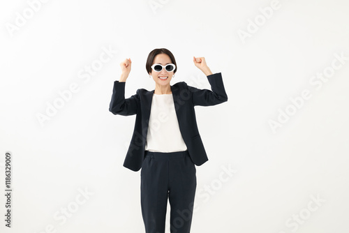 サングラスを掛けてガッツポーズをするビジネスウーマン