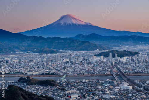静岡市朝鮮岩から朝焼けに染まる静岡市の街並みと富士山