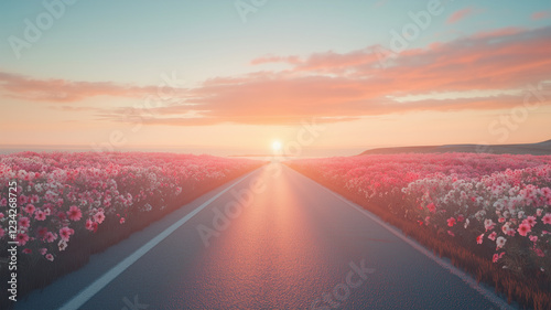 コスモスが彩る一本道、水平線へ続く秋のぬくもりを感じる風景