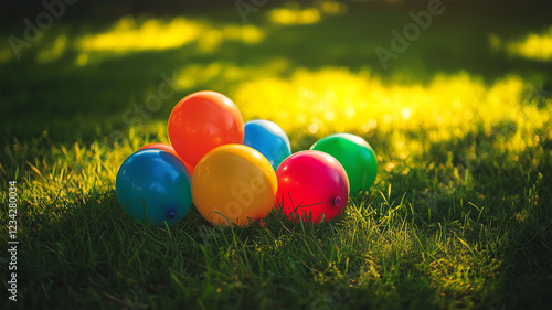 陽光に輝く風船と芝生、透明感と自由な空気感を描く一枚