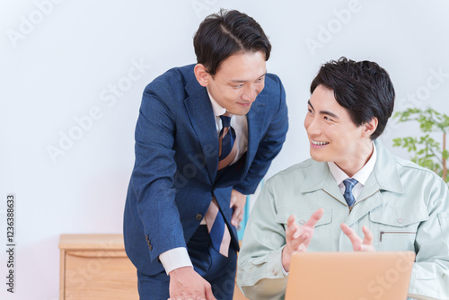 会議をするビジネスマンたち(スーツ・作業着・作業服)