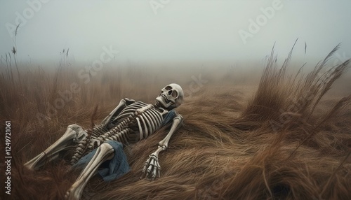불길한 안개가 자욱한 들판 한가운데, 반쯤 묻힌 채로 남아 있는 해골