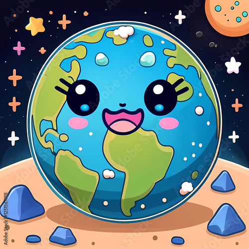 このデジタルグラフィックリソースは、かわいい遊び心のあるスタイルで描かれた地球を特徴としています。明るい表情とパステルカラーが魅力的で、星や惑星、銀河などの宇宙要素が楽しく幻想的な雰囲気を演出します。教育、持続可能性、子供向けコンテンツ、クリエイティブデザインのプロジェクトに最適です。
