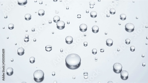 白い背景に輝く光を乱反射した透明な水滴が浮かぶ、清潔で爽やかなテクスチャー