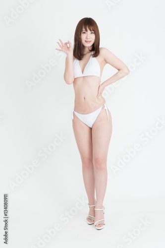 白いビキニの水着を着た若い女性。スタジオ撮影、白背景。