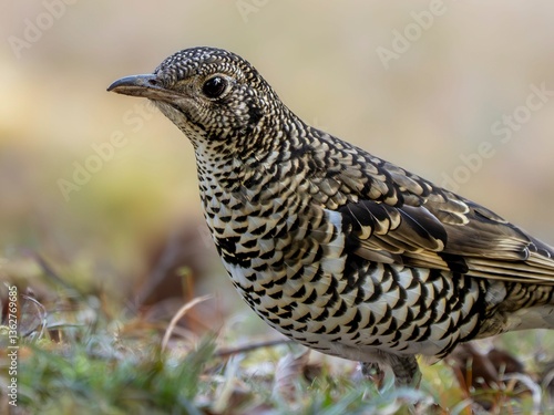 森の木陰で枯葉をひっくり返しているトラツグミ