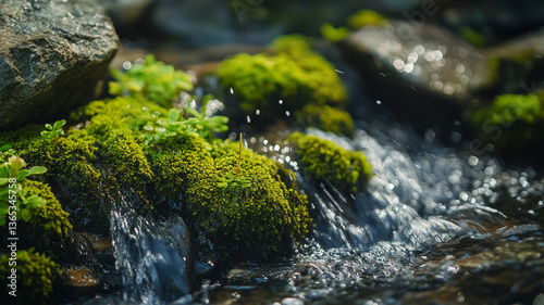 渓流沿いの濡れた岩に広がる苔と水滴が奏でる静かな時間
