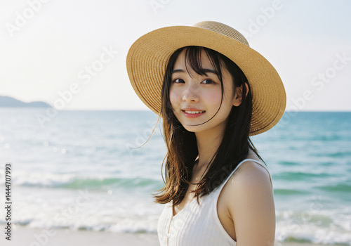 海辺で過ごす若い女性