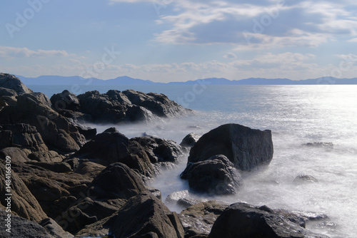 【長時間露光】岩場のある海岸と青空