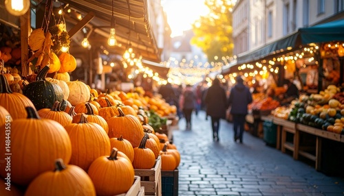 秋の街角マーケット、カボチャやスクワッシュが並ぶ屋台