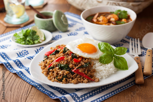【ガパオライス】スパイシーなバジルで炒めた鶏挽肉をライスに盛りつけました。夏になると食べたくなるタイ料理人気の一品。